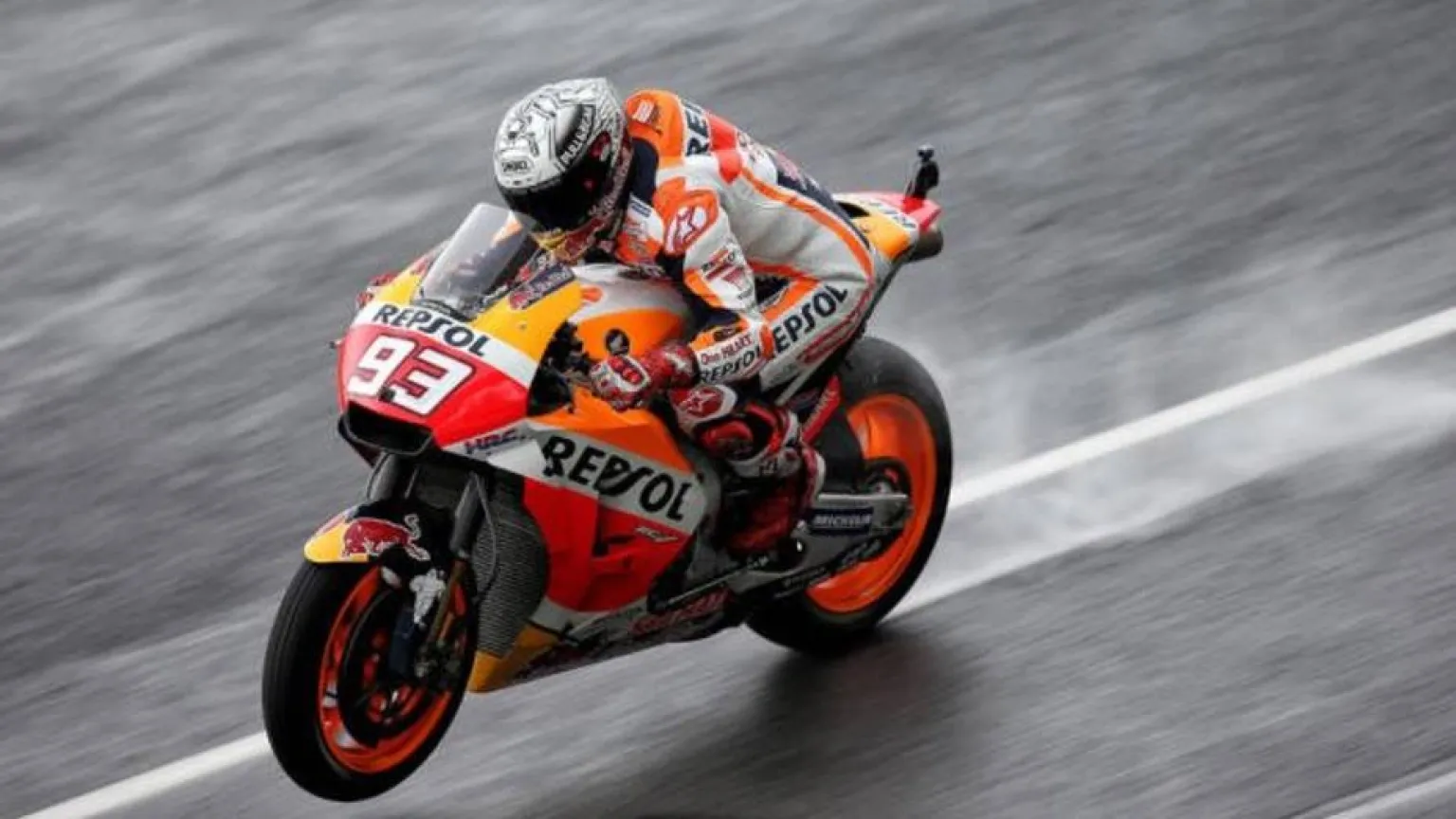 Marc Márquez protagonizó un recital bajo el agua en la segunda tanda de entrenamientos libres en Austria y si bien no fue de los primeros en salir a pista con el asfalto mojado, enseguida cogió el ritmo y en apenas cuatro vueltas ya marcó el mejor tiempo, 1:34.369, con el que batía al que por entonces era el piloto más rápido en condiciones de mojado, el británico Scott Redding (Aprilia RS-GP).