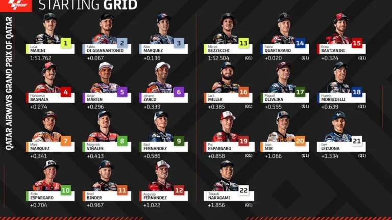 El piloto italiano Luca Marini (Ducati) ha conseguido este sábado la pole para las carreras de MotoGP del Gran Premio de Catar, decimonovena y penúltima cita del Mundial de motociclismo, mientras que los dos contendientes por el título, el también transalpino Francesco Bagnaia (Ducati) y el español Jorge Martín (Ducati), arrancarán cuarto y quinto, respectivamente.