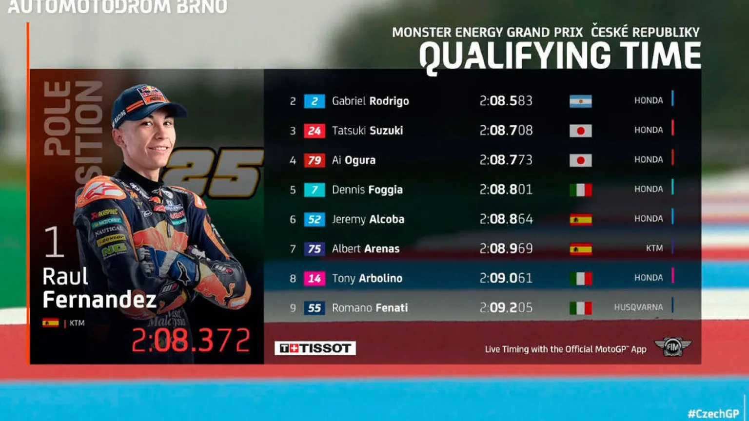 El español Raúl Fernández (KTM) consiguió la primera "pole position" de su carrera deportiva al ser el más rápido en la segunda clasificación para el G.P. de la República Checa, en el circuito de Brno, por delante del hispano argentino Gabriel Rodrigo (Honda) y el japonés Tatsuki Suzuki (Honda).