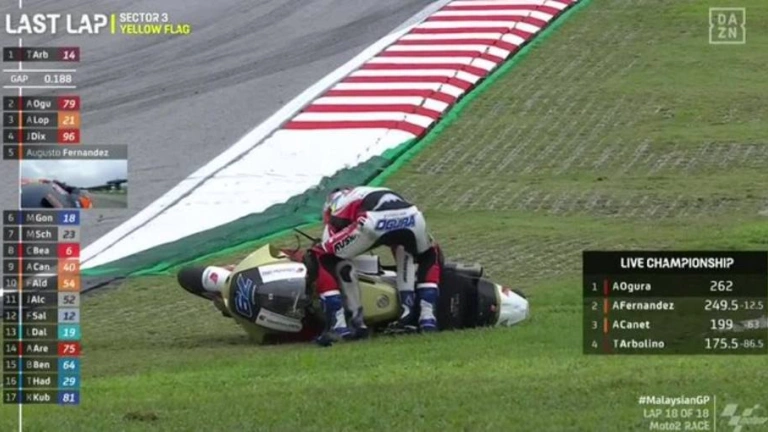 Ogura intentó superar a Arbolino en la última vuelta de la carrera de Moto2 pero su arriesgada acción acabó por los suelos y sin solución de continuidad, lo que permitió a Augusto Fernández recuperar la primera posición del campeonato con 9,5 puntos de ventaja sobre el japonés, al atravesar la línea de meta en el cuarto puesto.