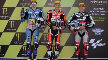 Por detrás, el italiano Lorenzo Baldasarri (Kalex) y Joan Mir (Estrella Galicia 0'0 Kalex) intentaban alcanzar a ese grupo pero en la rápida de entrada a la recta de meta el español -que era noveno- se fue por los suelos sin opción de continuar y con ello truncó una racha que, hasta la fecha, le había permitido puntuar en todas las carreras de la actual temporada.