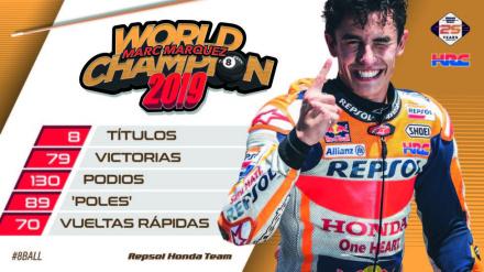 Con solo 26 años Márquez suma seis títulos de MotoGP (2013, 2014, 2016, 2017, 2018 y 2019), otro de 125 cc (2010) y otro de Moto2 (2012).
