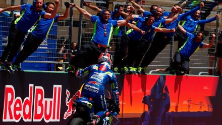 Primera victoria de Alex Rins en su carrera de MotoGP. Rossi y Jack Miller le acompañaron en el podio.