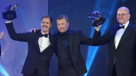 El finlandés apareció en la gala de final de la temporada de la FIA más divertido de lo normal tal y como demostró en el escenario junto a Vettel.