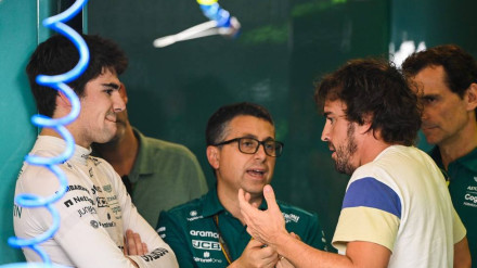 El compañero de Alonso en Aston Martin le dio un abrazo al asturiano durante una entrevista del español en zona mixta y le bromeó sobre su cambio de escudería