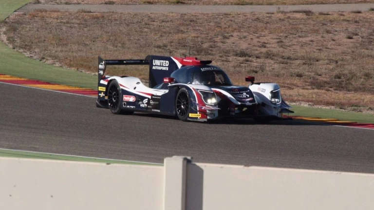 El equipo United Autosports, en el que se enrolará Alonso para Daytona, ha puesto en este test privado dos vehículos sobre el asfalto del trazado alcañizano, que en esta ocasión era el denominado "aero", con la recta trasera en su máxima longitud, con más de 1,2 kilómetros.