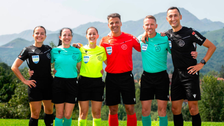 Tres árbitras y tres árbitros españoles presentan las equipaciones para la nueva temporada de fútbol. La novedad: la camiseta de color aguamarina.