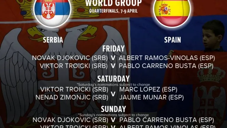 El sábado, en el turno de dobles, se enfrentarán a partir de las 16.00 horas Nenad Zimonjic y Viktori Troicki a Marc López y Jaume Munar. En el último día de la eliminatoria, se cruzarán Djokovic y Carreñas, y luego Troicki y Ramos.