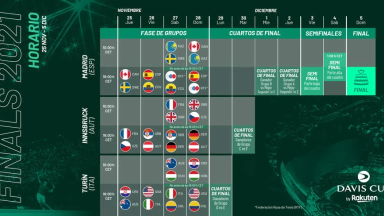 La fase de grupos se completará los días 27 y 28 de noviembre y los cuartos de final comenzarán el lunes 29 de noviembre. Las semifinales serán el 3 y el 4 de noviembre y la final el día 5. Todas las eliminatorias se jugarán a partir de las 16:00 horas (CET) y constarán de dos partidos individuales y uno de dobles.
