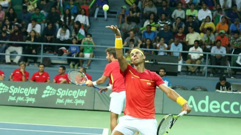 Rafa Nadal y Marc López han conseguido el punto decisivo en el encuentro de dobles al vencer a la pareja hindú Myneni- Paes en cuatro sets (4-6; 7-6; 6-4 y 6-4). Con esta victoria, España regresa al Grupo Mundial de la Copa Davis, tras las victorias de Ferrer y Feliciano López.