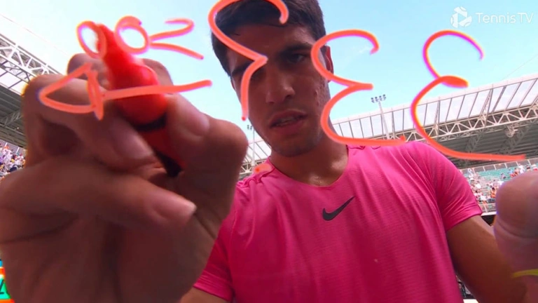Como es tradición al finalizar los partidos, los tenistas acuden a la cámara de televisión en la que suelen estampar su firma o dejar un mensaje. Tras su triunfo Alcaraz cumplió con el protócolo, tomó el rotulador y sorprendió a todos con los que plasmó en la pantalla: "33? Soon".