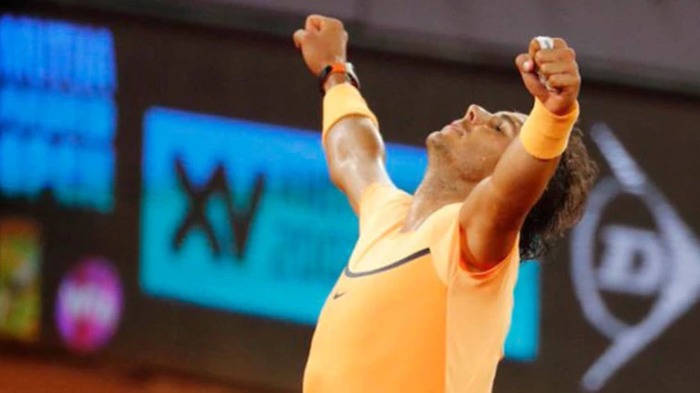 Con el techo abierto al principio, aprovechando un resquicio de la lluvia, y luego cerrado cuando arreció, Rafael Nadal vivió dos momentos diferentes, pero logró vencer al portugués Joao Sousa, 35 del mundo, por 6-0, 4-6 y 6-3 para llegar a las semifinales del Mutua Madrid Open contra el británico Andy Murray, el hombre que le arrebató el título el año pasado. El jugador escocés había derrotado antes al checo Tomas Berdych, por 6-3 y 6-2 en 76 minutos, en una gran demostración de poder. Nadal cedió el primer set de esta semana y sentenció en dos horas y cinco minutos. La clave es saber si mañana sábado se medirá a Murray en el duelo 24 entre ambos (17-6 para Nadal y 8-1 en tierra) con el techo cerrado o al aire libre. Nadal desplegó contra Sousa todo su arsenal, y ante los jugadores del Real Madrid Cristiano Ronaldo y Arbeloa, y Saúl, del Atlético entre otros, convirtió el primer set en un monólogo (25 minutos) y llevaba camino de endosar a Sousa una derrota similar a la que le infligió en Río de Janeiro el pasado año (6-1 y 6-0). Sousa, habitual en las concentraciones de Nadal en Manacor, donde acude invitado por el jugador español, conoce perfectamente el juego del ganador de 14 grandes, y a pesar de encajar un parcial de 7-0 no se derrumbó. Pero con 3-2 en el segundo, la lluvia obligó a interrumpir el encuentro, el techo se cerró y el partido cambió por completo. El portugués vio su opción, se desmelenó y pasó al ataque. Nadal notó más este cambio de situación y con la pista más pesada y los golpes planos de su rival cedió el primer set esta semana. En el último, Nadal recuperó la normalidad, y el público le ayudó con sus ánimos. Pero el cuatro veces ganador del torneo tuvo que sufrir para cerrar su victoria número 13 consecutiva en la temporada de tierra batida europea. "El segundo ha empezado igualado, y luego ha llegado este parón por la lluvia, que no nos ha venido muy bien", comentó Rafa. "Las pelotas estaban algo más mojadas, y más grandes, y todo era más complicado, no sentía que saltaban más. Me he ido perdiendo poco a poco y él ha jugado mejor. Hoy es como si no hubiera habido altitud", explicó. "He hecho la rotura en el momento ideal", dijo sobre el tercer set. "Estoy en semifinales, me hace mucha ilusión y eso es muy importante viniendo de donde veníamos", dijo.