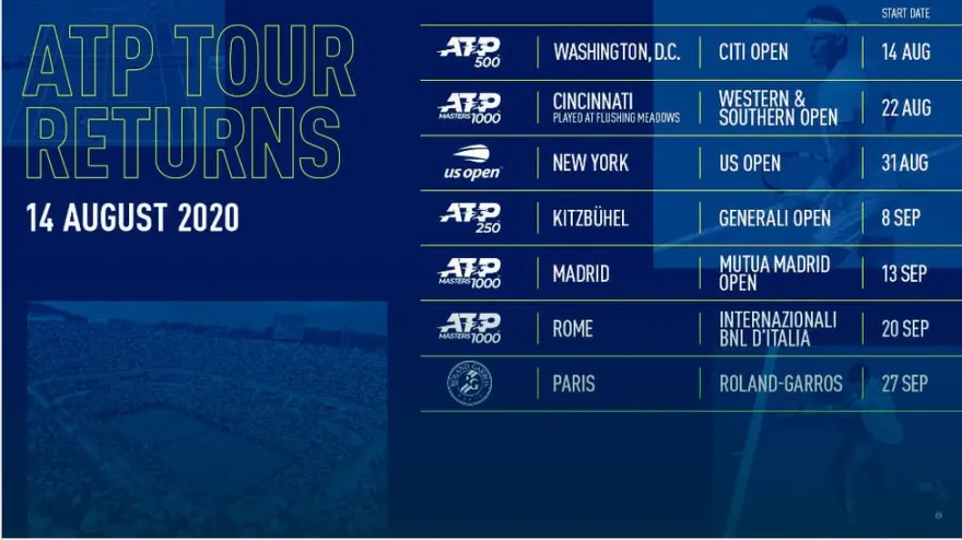 El US Open comenzará el 31 de agosto y Roland Garros lo hará el 27 de septiembre. El Mutua Madrid Open se jugará desde el 13 de septiembre.