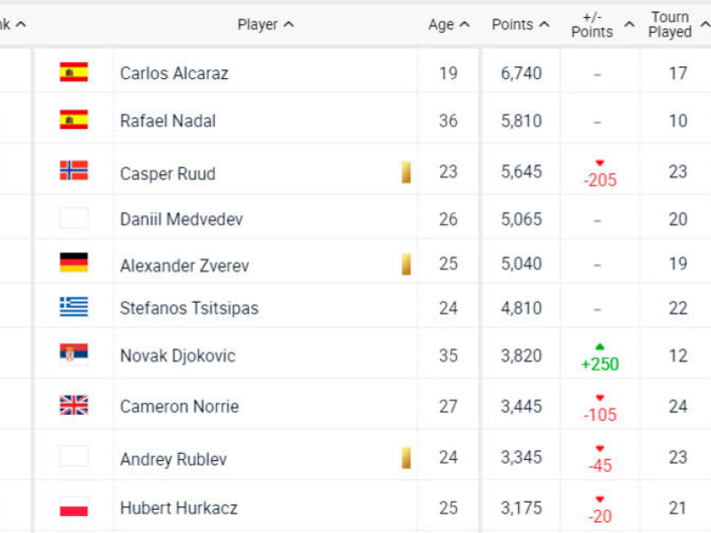 Sin grandes premios esta última semana, el serbio Novak Djokovic, que venció en el torneo de Tel Aviv y roza los 90 títulos individuales, no asciende ningún puesto y se mantiene séptimo. Dentro del 'top10', el italiano Jannik Sinner, que no defendió su título en Sofía del año pasado, y sale del club de los diez mejores del momento, ocupando ese décimo puesto ahora el polaco Hubert Hurkacz.