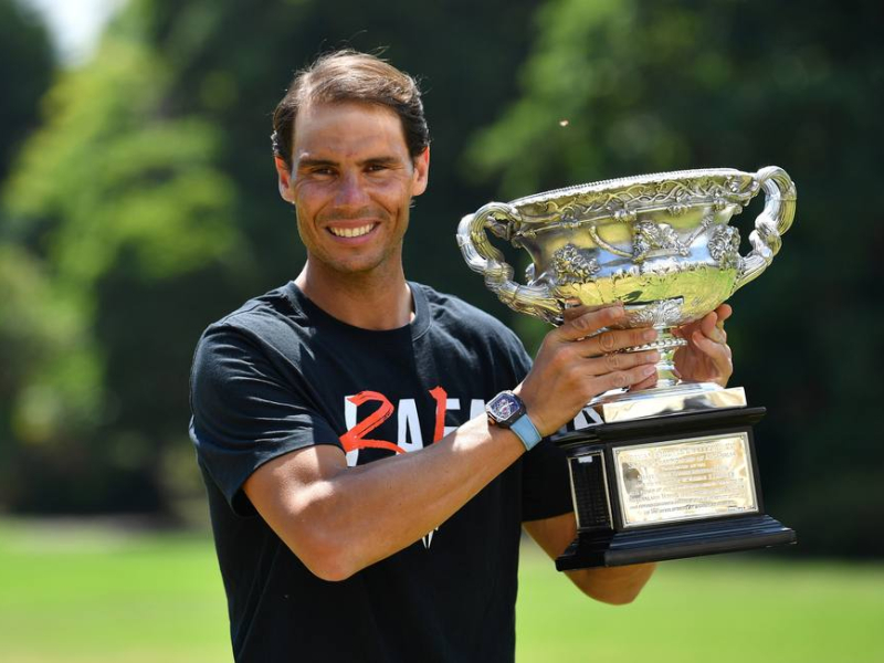 Rafa Nadal posa con el trofeo de ganador del Open de Australia en un parque de Melbourne.