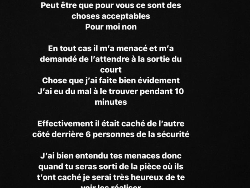 "Me amenazó y me ha invitado a vernos fuera. Cosa que he hecho durante diez minutos, pero no me lo he encontrado. Se ha ido por el otro lado rodeado por seis agentes de seguridad. Espero con impaciencia cuando lo podamos discutir con calma", escribió Moutet.