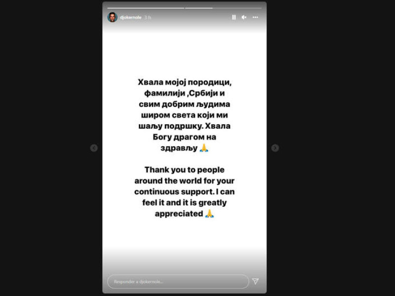En mitad de su reclutamiento, Novak Djokovic ha mandado un mensaje a través de su cuenta de Instagram: "Gracias a la gente alrededor del mundo por su continuo apoyo. Yo lo puedo sentir y estoy enormemente apreciado".