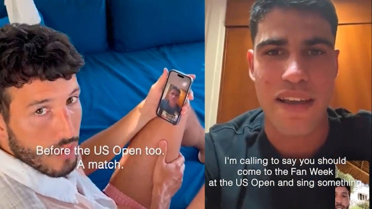"Me lo pienso... vale, acepto", le contesta el español, que aprovecha también para invitar al colombiano a jugar un partido con él antes de la competición oficial. "Yo no juego tenis... no, mentira, sí juego, y muy bien", revela Yatra. "Bueno, lo vemos en Nueva York", replica Alcaraz.