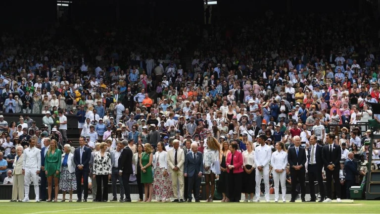 Tras un par de vídeos, una actuación musical del británico Cliff Richard, Barker y McEnroe dieron la bienvenida a la pista a algunos de los más grandes campeones del torneo, entre ellos Bjorn Borg, Federer, Chris Evert, Margaret Court, Billie Jean King...