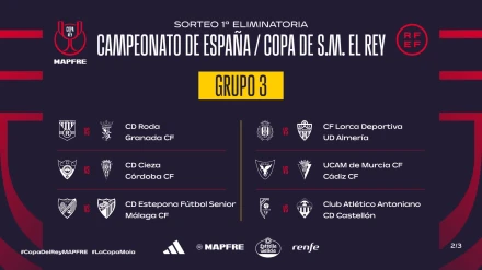 El sorteo de la Primera eliminatoria de Copa del Rey vuelve a emparejar a rojillos y blanquiazules. Esta vez se jugará en el Muñoz Pérez. Por su parte, Antequera y Torremolinos deberán sufrir largos viajes a Murcia y Valencia