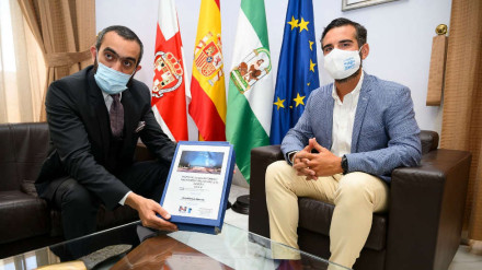 Ramón Fernández-Pacheco (alcalde de Almería) se ha reunido con Mohamed El Assy (director general de la UDA) para recibir el proyecto del Estadio de los Juegos Mediterráneos.