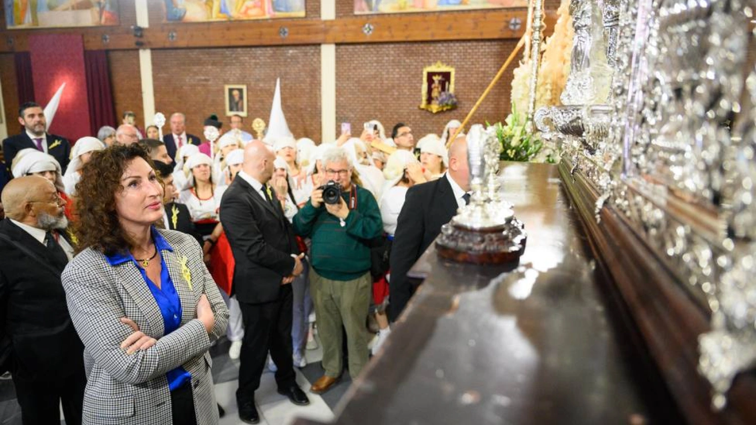 Posteriomente, la alcaldesa ha visitado la Hermandad y Cofradía de Nazarenos del Santísimo Cristo de la Misericordia en su Crucifixión y María Santísima de Los Ángeles, donde ha compartido unos minutos con los hermanos que estaban trabajando en los últimos preparativos previos a la procesión y ha podido comprobar la parte nueva tallada del trono del Cristo de la mano de su hermano mayor, Samuel Cañadas antes de firmar en el Libro de Honor de la Hermandad.
