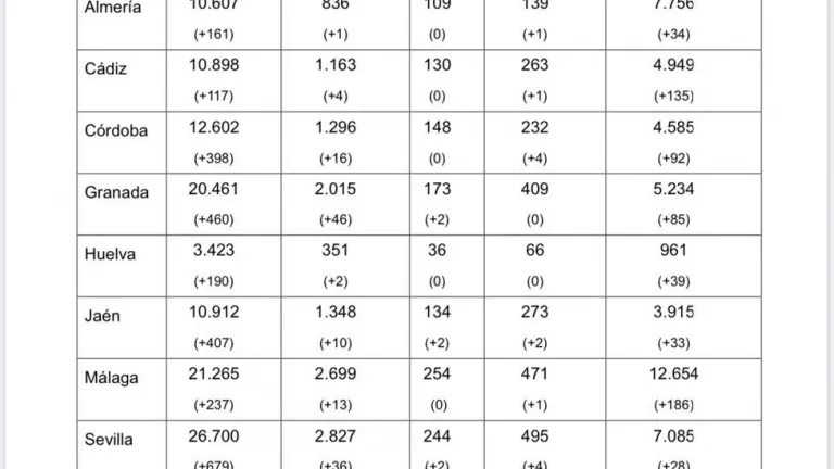 Los 161 nuevos positivos dejan a Almería como la segunda con menor número en 24 horas. Pero ya no tiene a Huelva como la que menos. Este lunes, con los datos de ayer, en Cádiz la que menos ha sumado (117). La provincia onubense ha registrado 190. Por encima, Málaga (237), Córdoba (398), Jaén (407), Granada (460) y Sevilla (679).