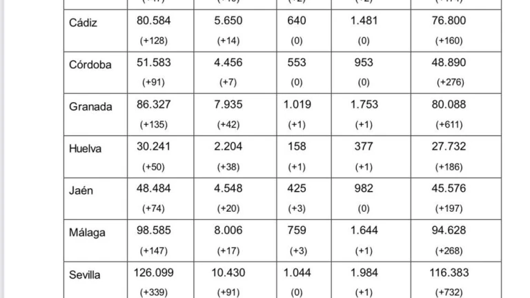 Una jornada más ha sido la que menos nuevos positivos ha sumado. Huelva (50), Jaén (74), Córdoba (91), Cádiz (128), Granada (135), Málaga (147) y Sevilla (338) le siguen de menor a mayor cuantía. Eso sí, es la segunda con el menos número de curados en 24 horas (174), siendo Cádiz la que menos (160).