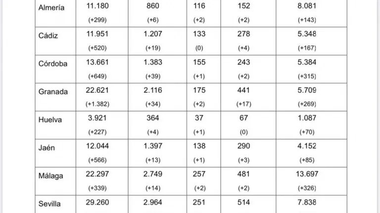 Por su parte, los hospitalizados están suponiendo un quebradero de cabeza para las autoridades sanitarias en toda Andalucía. Con Almería la que menor número tiene (66 y 10 en la UCI). Con más casos, Huelva (86 y 7), Cádiz (218 y 31), Córdoba (223 y 27), Málaga (238 y 34), Jaén (253 y 34), Granada (569 y 74) y Sevilla (691 y 79).
