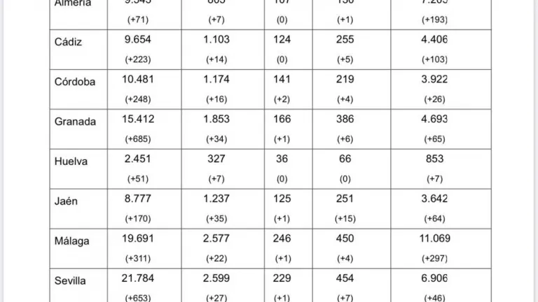 En comparación con Andalucía, Almería es, de nuevo, la segunda provincia con menos nuevos positivos, por detrás de Huelva (51), como también es habitual. Por encima, Jaén (170), Cádiz (223), Córdoba (248), Málaga (311), Sevilla (653) y Granada (685). En los curados, también la segunda, pero en el lado favorable. Málaga (297) suma más. Por debajo Cádiz (103), Granada (65), Jaén (64), Sevilla (46), Córdoba (26) y Huelva (7).