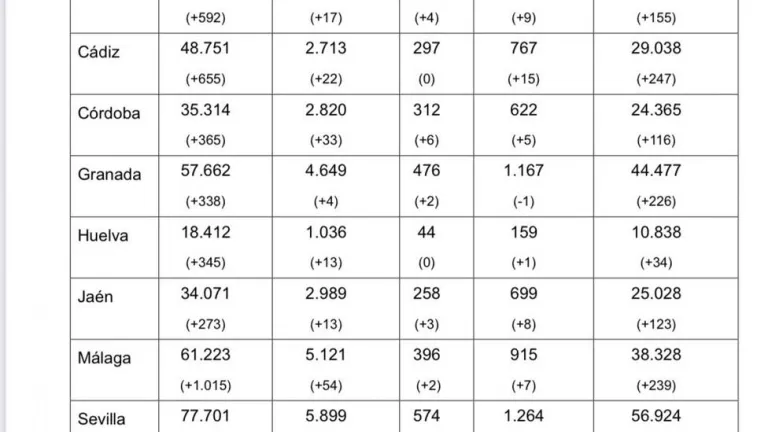 Comienzo de la semana y con datos muy similares en cuanto a los facilitados por la Junta de Andalucía el pasado lunes. Rozando los 600 nuevos positivos en las últimas 24 horas (592, por los 571 de hace siete días). Mejorando el anuncio de los curados (155, 21). Con un incremento considerable en cuanto a los fallecidos (9, 1), mientras que los ingresados se cifran en 17, mientras que hace una semana fueron 5. En UCI, 4 (1).