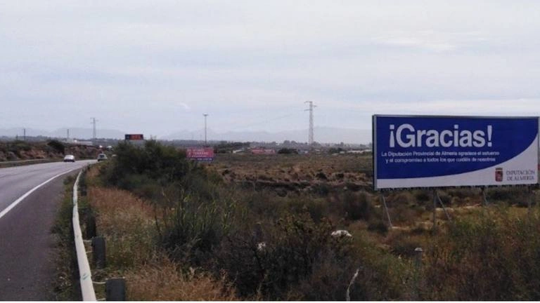 La Diputación de Almería está instalando vallas con la leyenda "¡Gracias!" en los principales accesos a los centros sanitarios y a las zonas agrícolas y logísticas de la provincia.