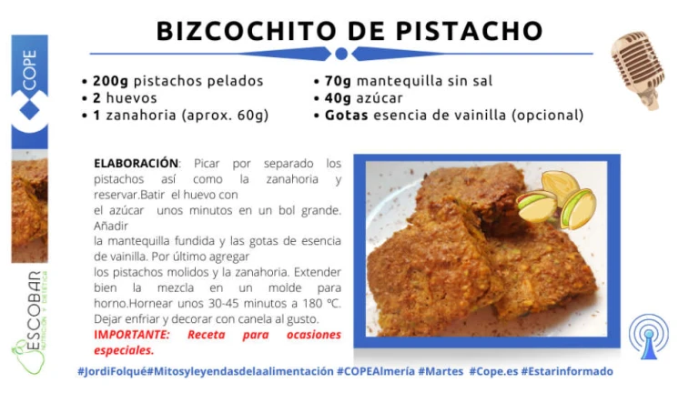 Nuestra nutricionista nos habla hoy del pistacho. Un fruto seco muy recomendable. La receta de hoy es un 'capricho'.