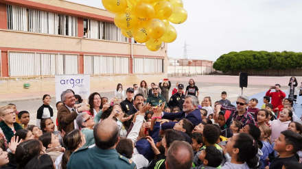 Más de 150 alumnos del CEIP El Puche participan en el acto, presidido por un gran lazo dorado, con el apoyo de las instituciones.