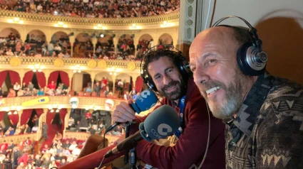 Javier Ruibal muestra su Goya en el palco de COPE en el Falla