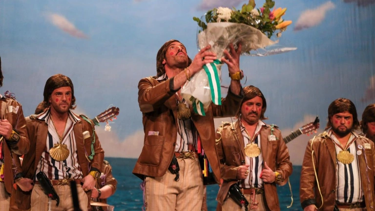 Para empezar porque son los primeros que han dedicado un pasodoble a Julio Pardo. Una letra metida horas antes y que salió a la perfección. Asimismo, y teniendo en cuenta que ellos tenían varias bromas con los coros, la chirigota quiso tener varios detalles con Julio Pardo, por ejemplo un ramo de flores.