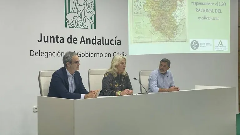 La delegada del Gobierno de la Junta de Andalucía en Cádiz, Mercedes Colombo, en compañía del presidente del Colegio Oficial de Farmacéuticos, Ernesto Cervilla y del delegado territorial de Inclusión Social, Juventud, Familias e Igualdad, Alfonso Cándón, han participado en la jornada “Cádiz, provincia responsable en el uso racional del medicamento”. A esta jornada han asistido más de cien personas de distintos colectivos y asociaciones de la provincia. La jornada se ha celebrado en el salón de actos de la delegación del Gobierno andaluz en Cádiz.