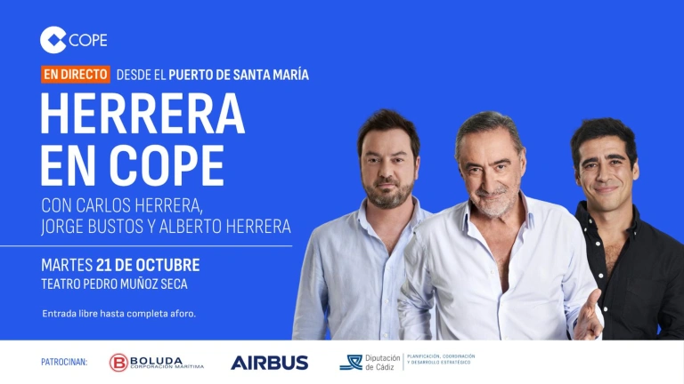 El Puerto de Santa María acoge este próximo martes 21 de octubre al programa referencia de la radio española, 'Herrera en COPE'. Una oportunidad única para vivir en directo toda la actualidad y el entretenimiento de la mano de los líderes de la radio, Carlos Herrera, Jorge Bustos y Alberto Herrera.