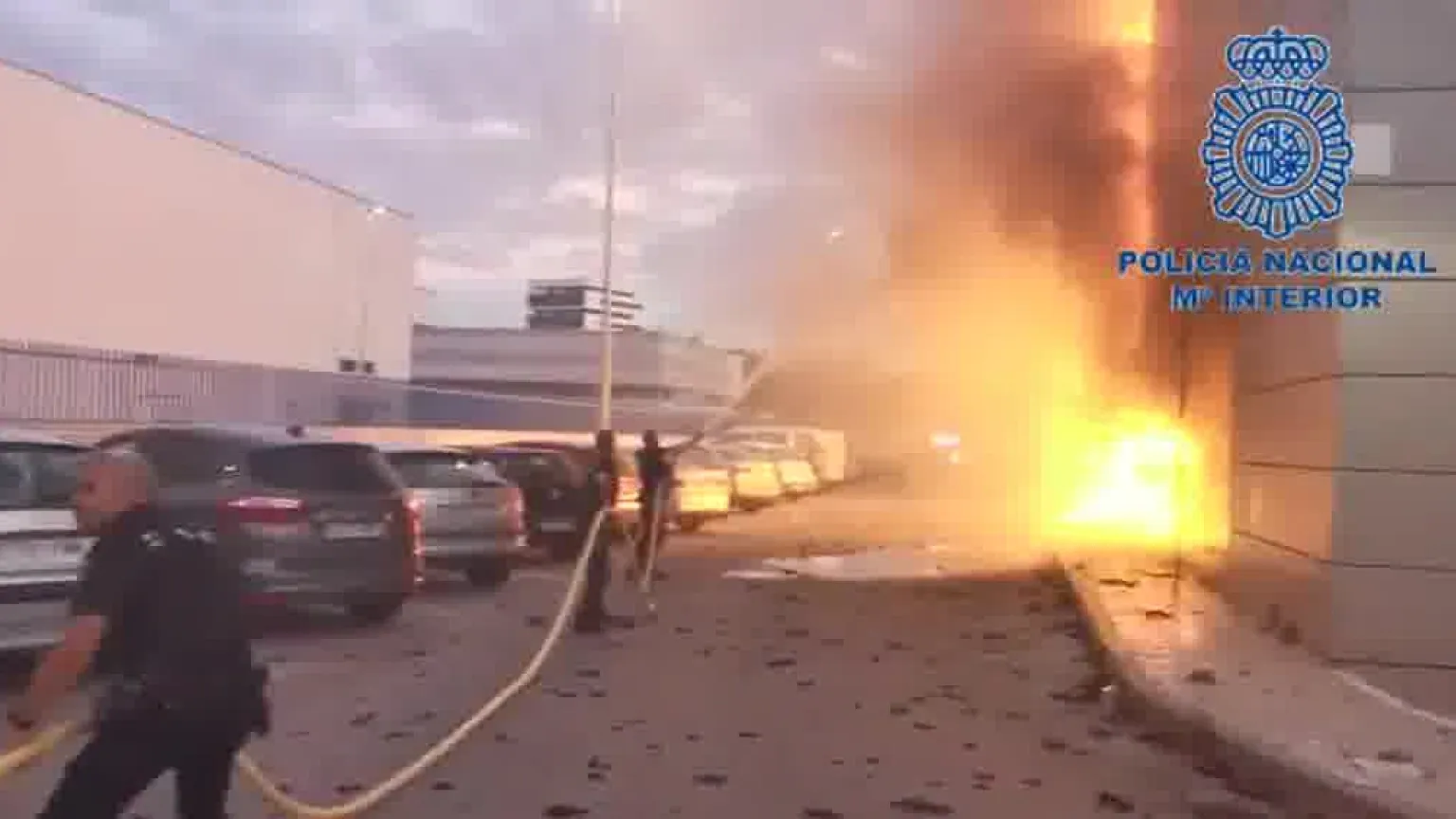 Intervención de agentes de la Policía Nacional que junto con otras personas han utilizado las bocas de incendio equipadas en el Poligono Exterior de Zona Franca para tratar de controlar y sofocar el incendio producido en una de las naves.