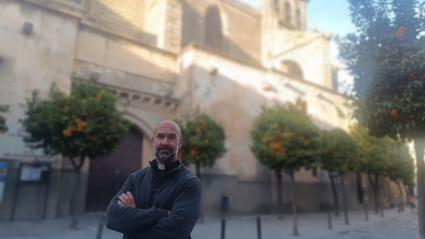 El sacerdote Carlos Redondo ante la parroquia de San Marcos