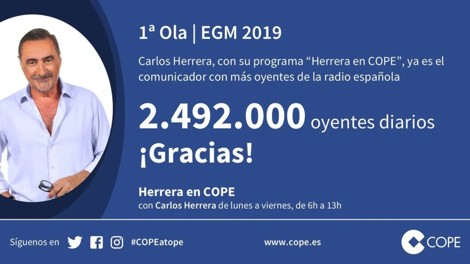 En opinión del presidente del Grupo COPE, Fernando Giménez Barriocanal, “en estos tiempos en España, la información y la opinión son más importantes que nunca para los oyentes, por eso contamos en COPE con el comunicador referente para ellos como es Carlos Herrera. Y en el deporte, con Paco, Pepe, Manolo y todo el equipo líder de la radio deportiva. Dos motores que fortalecen nuestra marca junto al resto de comunicadores y programas”.