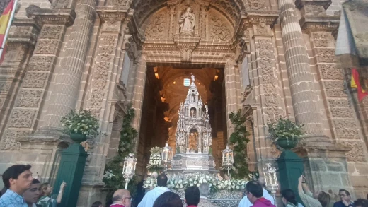 Y fue colocada la hostia consagrada en el viril de la custodia ya preparada en la carroza sacramental que labrara en su día Gabella. Casi al unísono, las representaciones eran organizadas en la puerta principal de la Catedral. Se ocupaba la Hermandad de la Amargura, escogida este año por la Unión de Hermandades entre las sacramentales de la ciudad para esta coordinación. La procesión ya en la calle, el público esperando en el Reducto catedralicio bajo un sol de justicia, y la agrupación abriendo marcha mientras al Santísimo lo aguardaba la Banda Municipal. Dos horas de marcha por delante.
