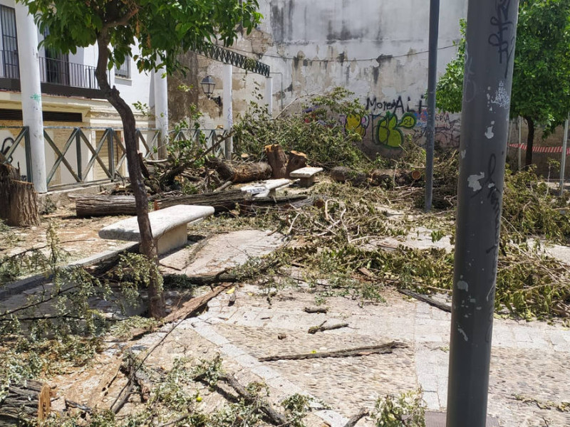 Estas labores en esta plaza de Jerez se sumarían, según esta organización, "a la ya larga lista de despropósitos hacía nuestro patrimonio arbóreo y hacia la avifauna que lo habita"