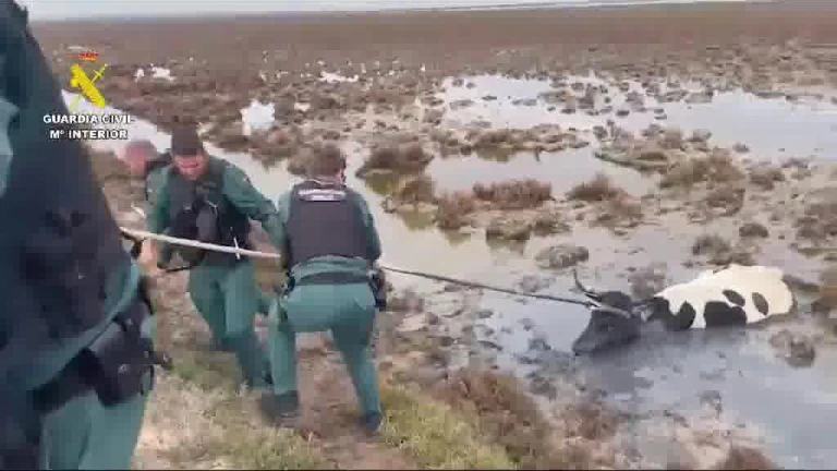 Así se las ven para rescatar una vaca del fango de las Marismas del Guadalquivir