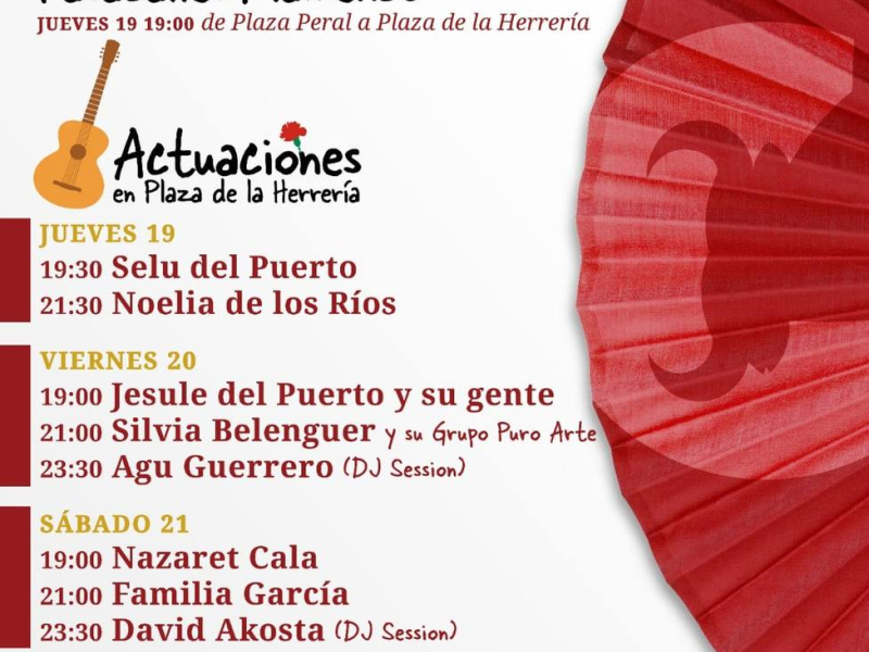 El sábado 21, Nazaret Cala abre cartel a las 19.00 horas, seguida por la Familia García a las 21.00 horas y Davi Akosta a las 23.30 como colofón con la DJ Session. Luna Gitana actuará el domingo 22 a las 12 del mediodía y el Grupo a´compas a las dos de la tarde.