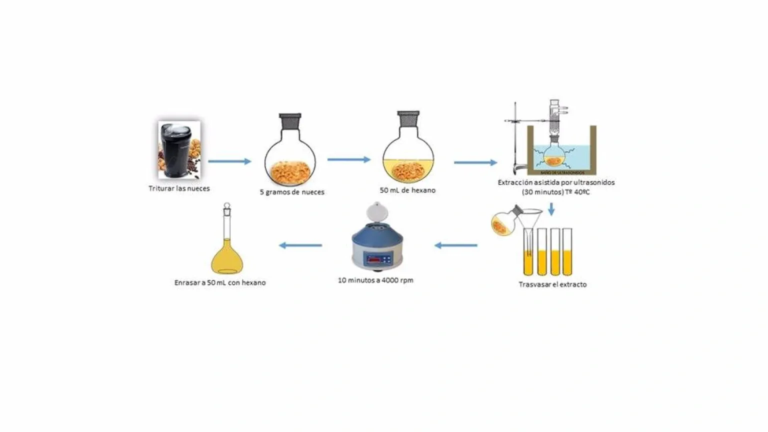 Para obtener estos resultados, el primer paso que realizaron los expertos fue pelar, triturar en un molinillo y desgrasar las nueces utilizando un método basado en ultrasonidos y que fue desarrollado en el laboratorio de este grupo de investigación.