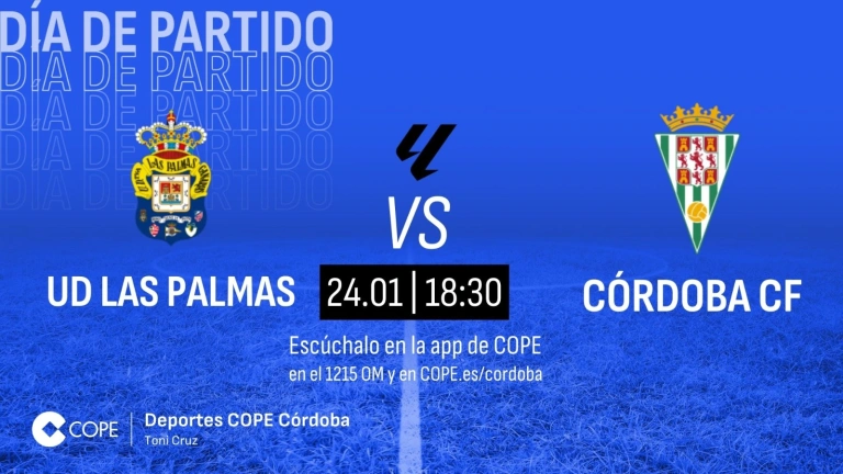 El partido Las Palmas-Córdoba lo podrás seguir el domingo desde las 18:20 horas con la narración de Toni Cruz en el Tiempo de Juego de COPE Córdoba en el dial 1215 AM y desde cualquier lugar a través de la web de COPE Córdoba y en las aplicaciones de COPE y Tiempo de Juego seleccionando la emisora de COPE Córdoba.
