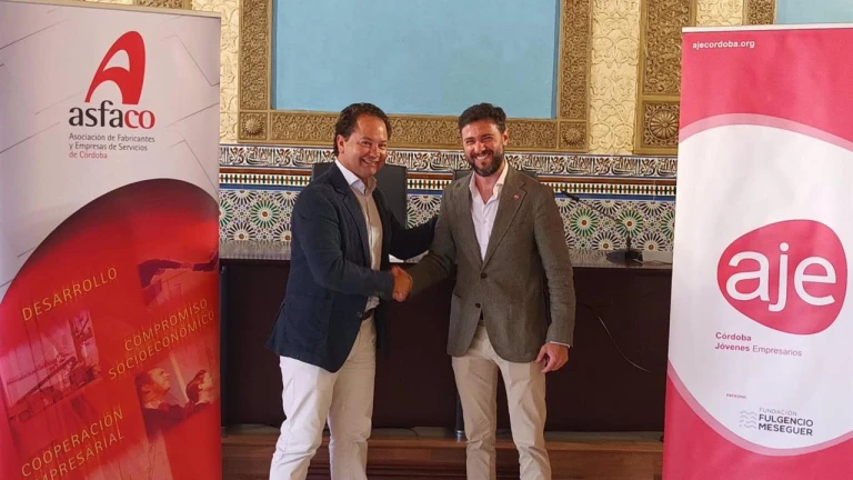 El presidente de la Asociación de Empresas Fabricantes y de Servicios de Córdoba (Asfaco), Miguel Ángel Tamarit, y el presidente de la Asociación de Jóvenes Empresarios (AJE) de Córdoba, Víctor Macías, han firmado un convenio de colaboración este jueves con el objetivo de aunar esfuerzos y establecer estrategias de actuación que favorezcan el impulso del emprendimiento y la innovación en la región.