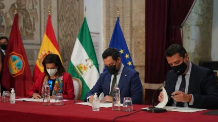 La ministra de Defensa, Margarita Robles; el presidente de la Junta, Juanma Moreno, y el alcalde firmaron el viernes 17 el protocolo general de actuación y de convenio para el desarrollo del proyecto de la base logística del Ejército de Tierra 'General de Ejército Javier Varela', que se impulsará en la zona de La Rinconada y será un motor tecnológico, de creación de empleo y de 'I+D+I' para la región.