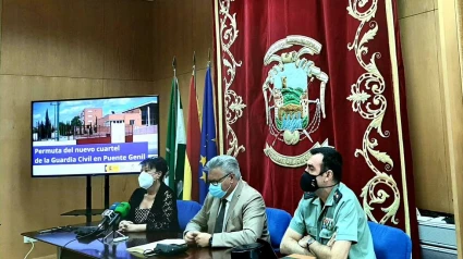 La subdelegada del Gobierno en Córdoba, Rafaela Valenzuela, el alcalde de Puente Genil, Esteban Morales y el jefe de la Comandancia de la Guardia Civil de Córdoba, el teniente coronel Juan Carretero, han comparecido esta mañana en el Ayuntamiento de Puente Genil para anunciar la suscripción de la permuta del nuevo cuartel de la Guardia Civil en el municipio.